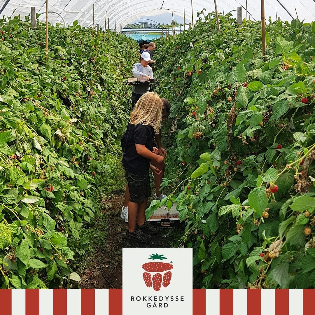 Når du kommer til Rokkedyssegaard, guider vi dig ud til bærhuset i marken. Der viser du billetten, du får vejet emballage. Du får at vide, hvor der er bær og frugt, som er klar til at blive plukket.