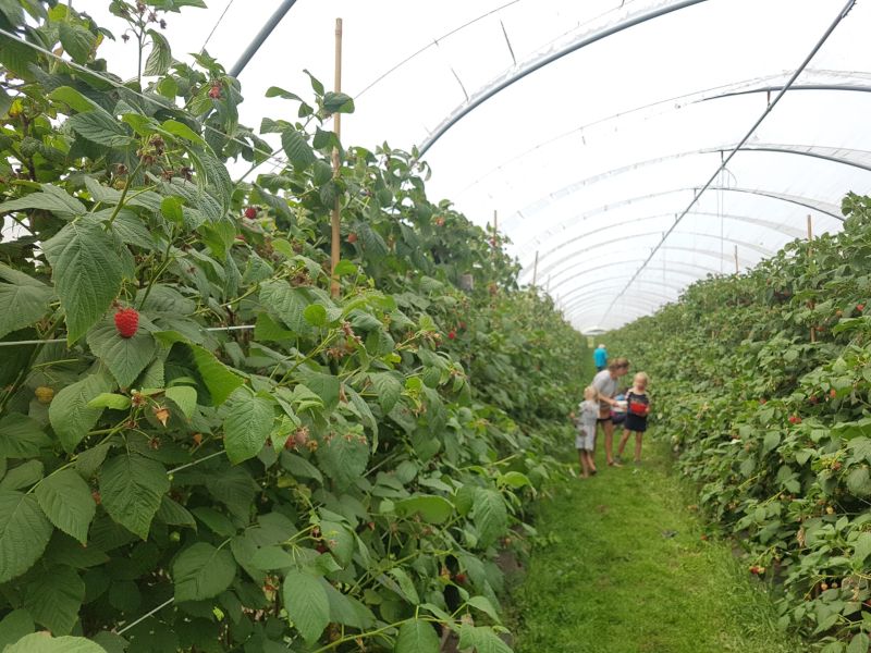 At plukke hindbær er lidt jungleagtigt, da vi dyrker vores hindbær i store tunneler, som er til for at give god vækst og beskytte bærrene mod vind og vejr.